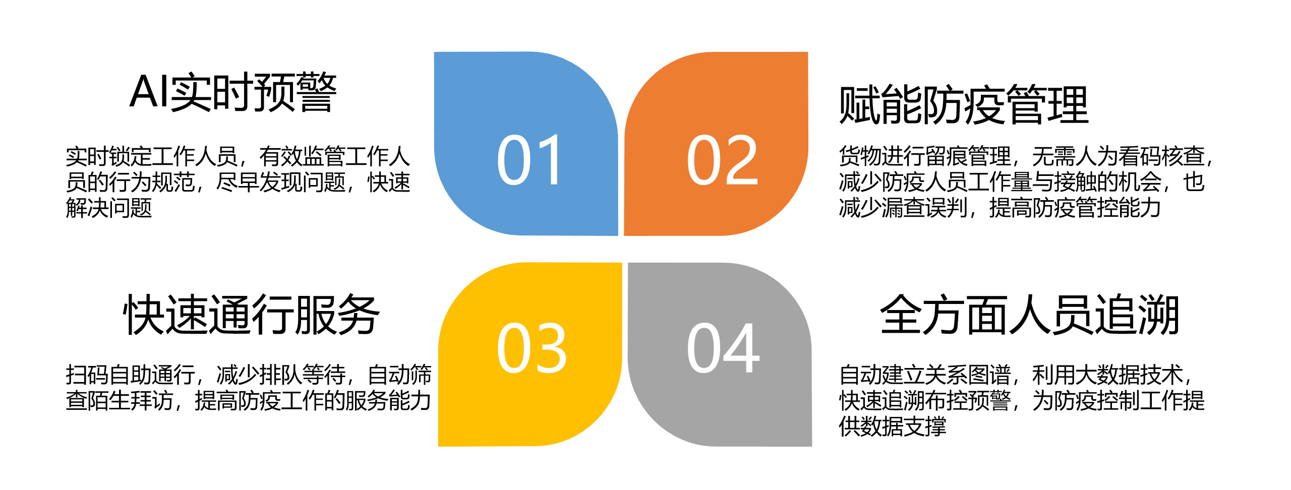 AI 冷链精准防疫解决方案包括:前端网络摄像机,AI 接入网关、云端 AIoT 管理平台、云 AI 管理组成。