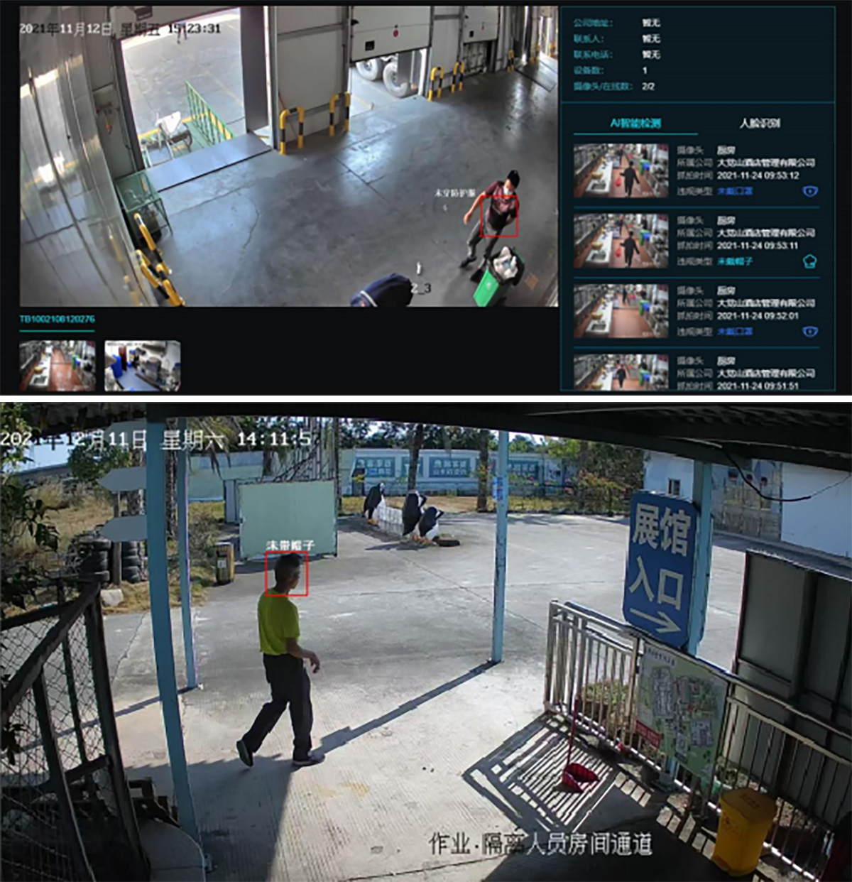 冷库区域的网络摄像机通过冷库 AI 接入网关,以及 AIoT 平台“云+边协同”实现 AI 智 能分析,实现对工作人员进行实时检测,工作人员在工作期间出现违规操作会自动产生报警,上报到平台。