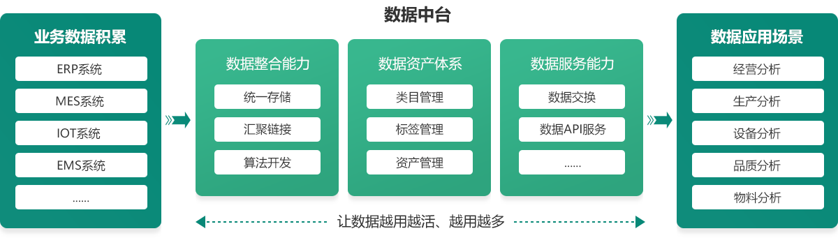 构建数据中台,实现企业主数据管理、业务数据聚合,打造企业数据资产,让数据来源于生产、服务于生产