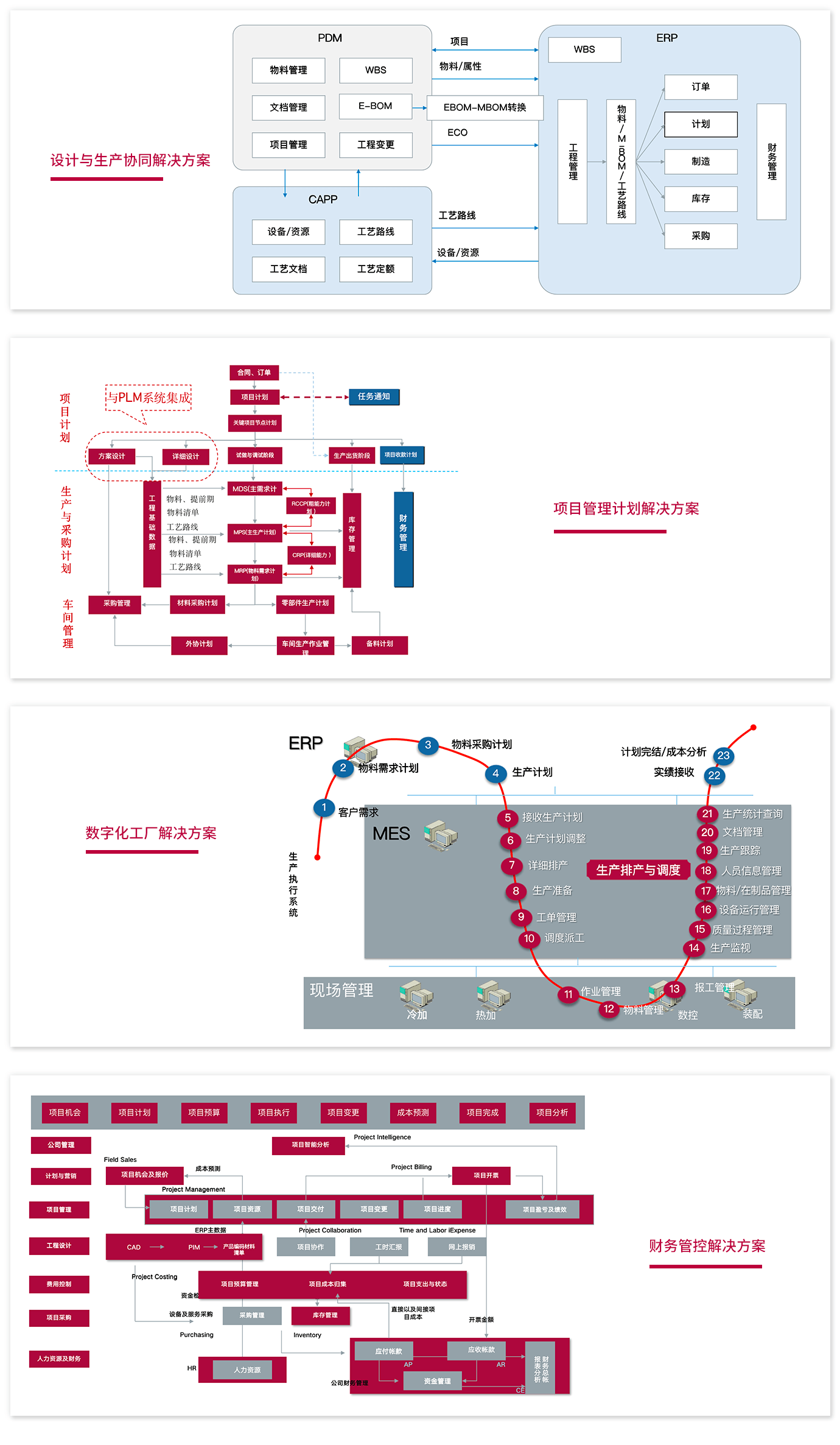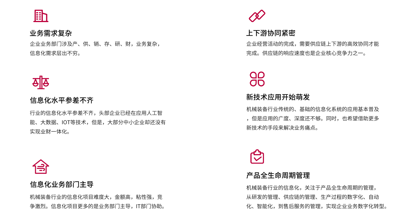 关注于产品全生命周期的管理,从研发的管理、供应链的管理、生产过程的数字化、自动化、智能化,到售后服务的管理,实现企业业务数字化转型。