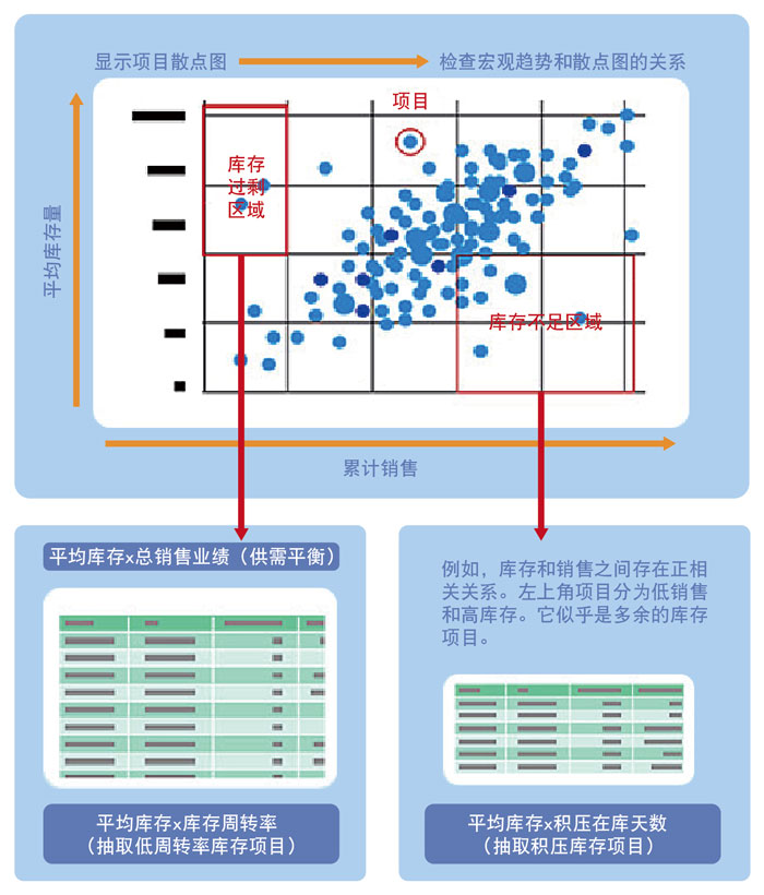 从平均库存和总销售的散点图中检查供需平衡,从库存不足和库存过剩地区提取问题库存。