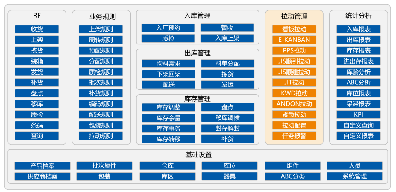 打造从采购、领料、生产、仓储到发货及售后等智能化厂内全作业环节。不但包含传统WMS的出入库、盘点等库存管理基本功能,还重点将仓储管理与物流管理有效地融合在一起,以信息流驱动实物流,并以实物流反馈信息流的执行进度,真正将仓库内、仓库与仓库之间、仓库与车间之间的业务实现高效的统一,打造企业精益仓储物流体系。